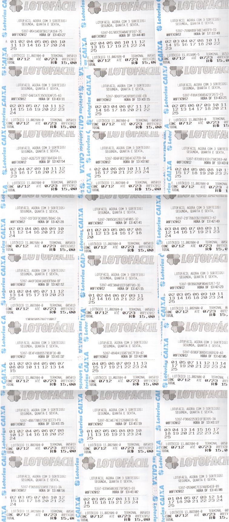 Neste bolão cada pessoa paga R$ 15,00 para participar. R$ 15,00 serão utilizados para fazer um jogo da lotofácil com 15 números (teimosinha 12 concursos) na lotérica. Não haverá caixinha neste bolão. Qualquer premiação será dividida em cotas de acordo com a quantidade de jogos. O autor de cada jogo tem direito a uma cota. Assim, a pessoa que faz mais de um jogo para o bolão terá a quantidade de cotas no prêmio igual a quantidade de jogos de sua autoria.