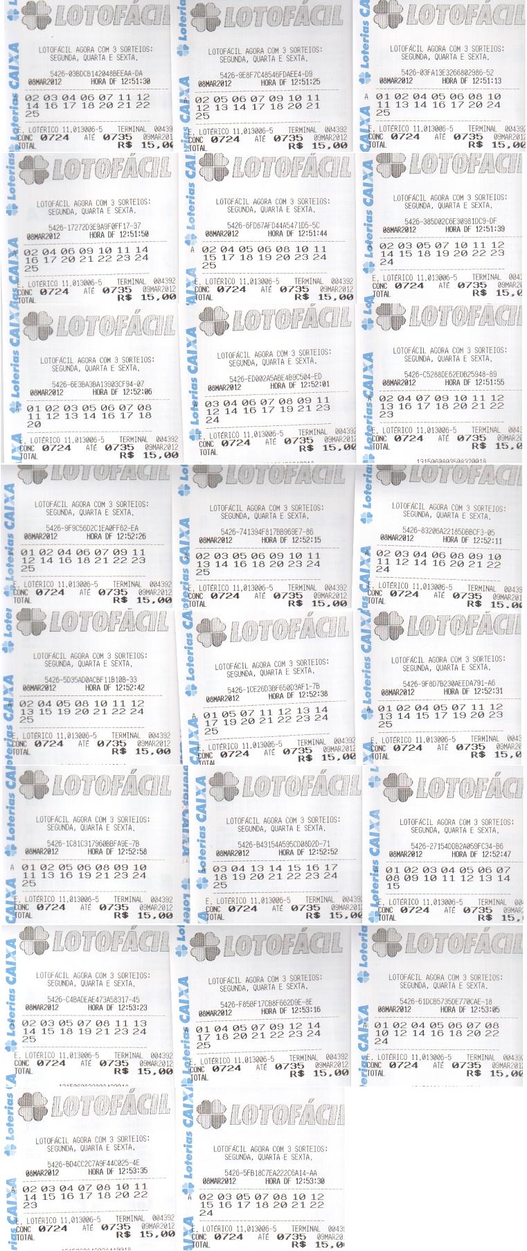 Neste bolão cada pessoa paga R$ 15,00 para participar. R$ 15,00 serão utilizados para fazer um jogo da lotofácil com 15 números (teimosinha 12 concursos) na lotérica. Não haverá caixinha neste bolão. Qualquer premiação será dividida em cotas de acordo com a quantidade de jogos. O autor de cada jogo tem direito a uma cota. Assim, a pessoa que faz mais de um jogo para o bolão terá a quantidade de cotas no prêmio igual a quantidade de jogos de sua autoria.