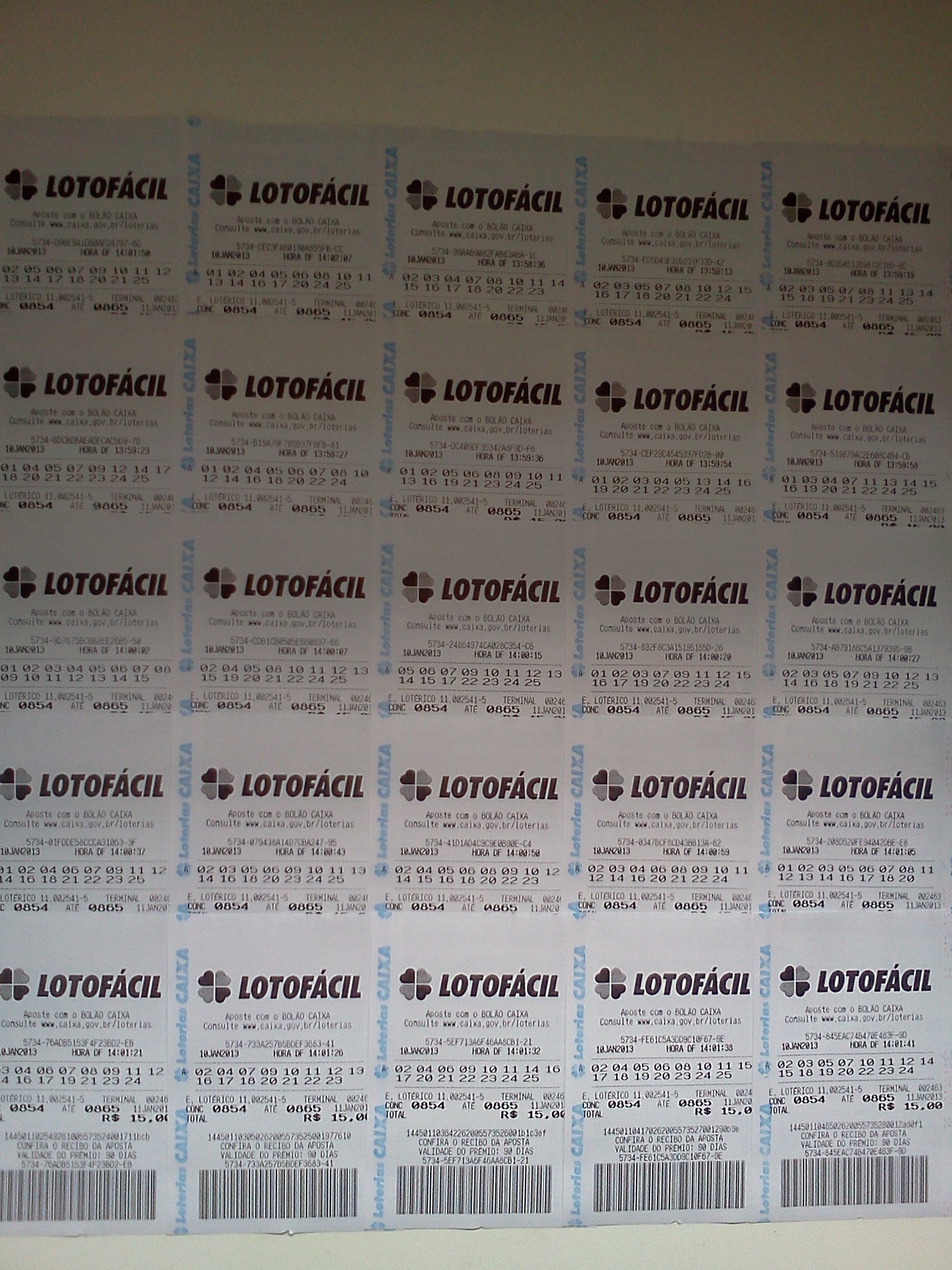 Neste bolão cada pessoa paga R$ 15,00 para participar. R$ 15,00 serão utilizados para fazer um jogo da lotofácil com 15 números (teimosinha 12 concursos) na lotérica. Não haverá caixinha neste bolão. Qualquer premiação será dividida em cotas de acordo com a quantidade de jogos. O autor de cada jogo tem direito a uma cota. Assim, a pessoa que faz mais de um jogo para o bolão terá a quantidade de cotas no prêmio igual a quantidade de jogos de sua autoria.