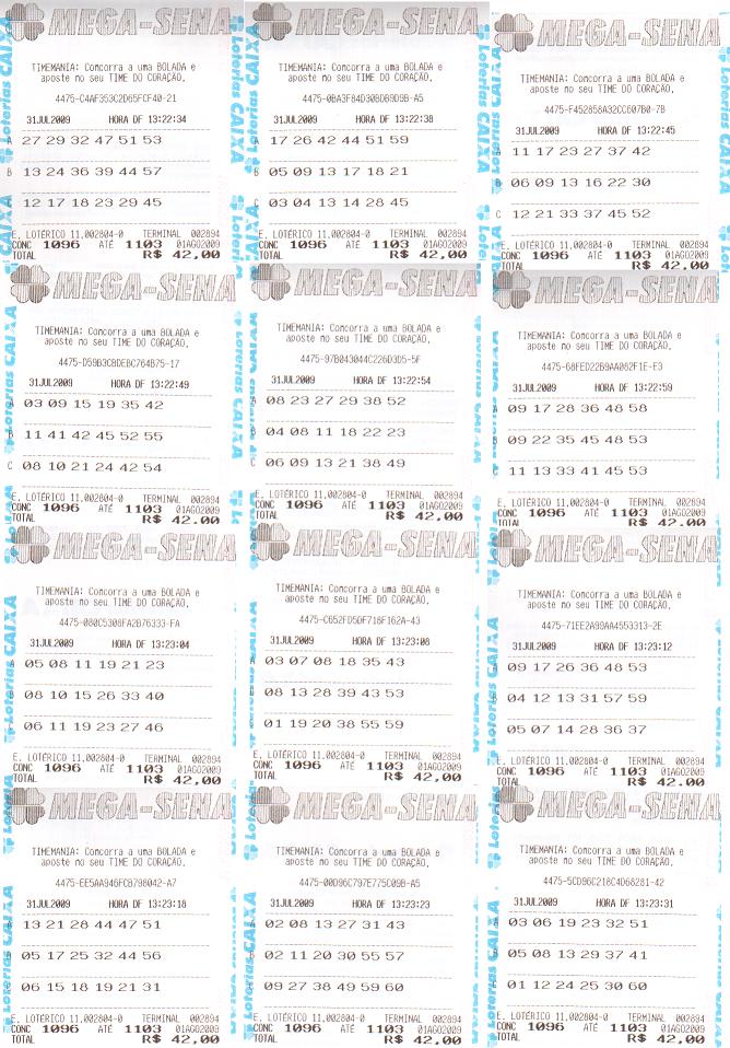 Neste bolão cada pessoa paga R$ 20,00 para participar. R$ 14,00 serão utilizados para fazer um jogo da mega-sena com 6 números (teimosinha 8 concursos) na lotérica. Os R$ 6,00 restantes são depositados em uma caixinha para premiar a pessoa que sugeriu o jogo que teve mais acertos no final do bolão. Esta informação pode ser acompanhada pelo link RESUMO. Qualquer premiação (quadra, quina ou sena) será dividida igualmente entre todos os participantes.