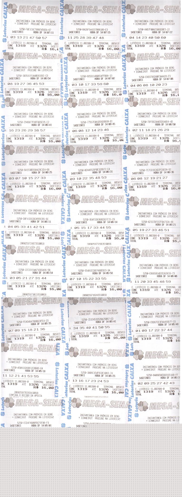 Neste bolão cada pessoa paga R$ 20,00 para participar. R$ 16,00 serão utilizados para fazer um jogo da mega-sena com 6 números (teimosinha 8 concursos) na lotérica. Os R$ 4,00 restantes são depositados em uma caixinha para premiar o autor do jogo que teve mais acertos no final do bolão. Esta informação pode ser acompanhada pelo link RESUMO. Qualquer premiação (quadra, quina ou sena) será dividida em cotas de acordo com a quantidade de jogos. O autor de cada jogo tem direito a uma cota. Assim, a pessoa que faz mais de um jogo para o bolão terá a quantidade de cotas no prêmio igual a quantidade de jogos de sua autoria.