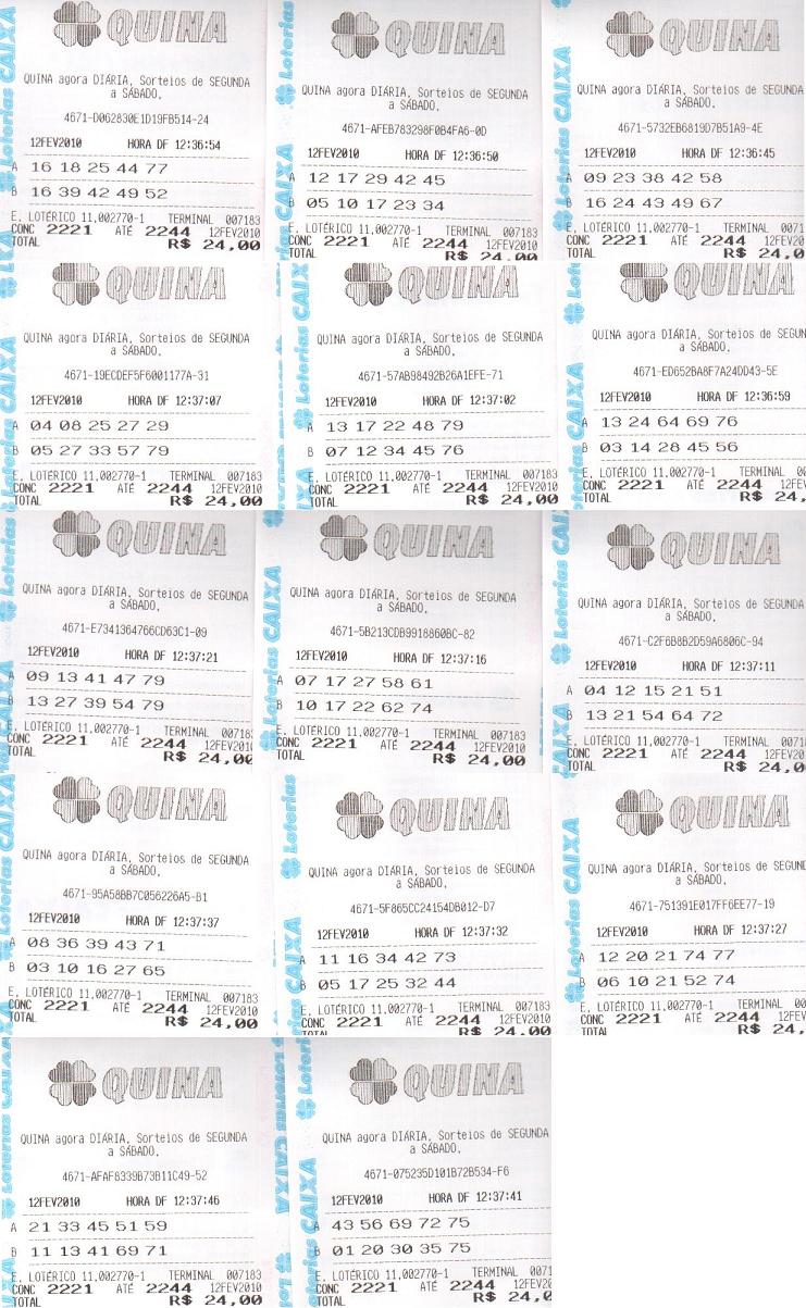 Neste bolão cada pessoa paga R$ 15,00 para participar. R$ 12,00 serão utilizados para fazer um jogo da quina com 5 números (teimosinha 24 concursos) na lotérica. Os R$ 3,00 restantes são depositados em uma caixinha para premiar o autor do jogo que teve mais acertos no final do bolão. Esta informação pode ser acompanhada pelo link RESUMO. Qualquer premiação (terno, quadra ou quina) será dividida em cotas de acordo com a quantidade de jogos. O autor de cada jogo tem direito a uma cota. Assim, a pessoa que faz mais de um jogo para o bolão terá a quantidade de cotas no prêmio igual a quantidade de jogos de sua autoria.